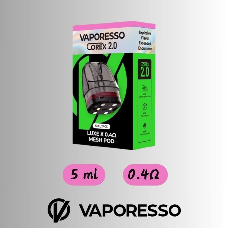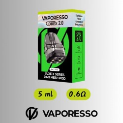 Cartouches pods de 5ml et munies d'une résistance intégrée de 0,4 ou de 0,6 ohm. Elles sont destinées à la gamme Luxe X de Vaporesso, comme le Luxe X2 ou le Luxe XR Max2.